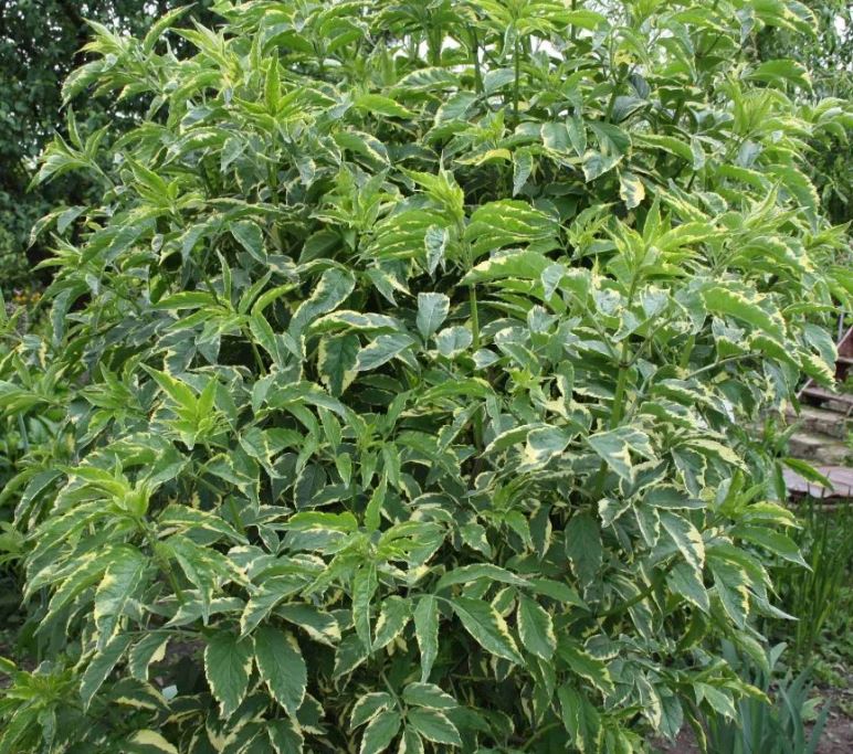 Бузина Вариегата неприхотлива в уходе и достигает высоты до 2,5 метров. Листва состоит из 5-7 листочков зеленого цвета с бело-кремовыми краями, что придает кустарнику особую декоративность. Плоды черные с блеском и очень сочные.