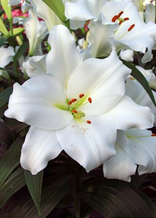 Лилия Фредо (Fredo) представляет собой уникальный сорт, относящийся к ЛО-гибридам. Этот сорт начинает цвести в конце июня, радуя крупными цветками диаметром до 20 см, которые имеют широкую воронковидную форму. Лепестки белоснежные с легкой волнистостью по краям, что придает цветку особую изысканность. Высота растения достигает 120 см, а его тонкий и нежный аромат добавляет саду утонченности.