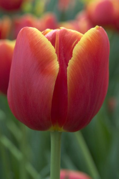Тюльпан "Веранди" – это идеальный выбор для весеннего украшения клумб благодаря своей яркой и насыщенной окраске. Его бутоны имеют красный цвет с нежной желтой каймой, что делает их особенно выразительными на фоне мощных и широких зеленых листьев. Высота растения может достигать 50-60 см при правильном уходе, включая оптимальную влажность и освещение. Крупные и упругие бокаловидные цветки долго сохраняют свежесть в срезанном виде, что делает их отличным выбором для букетов.