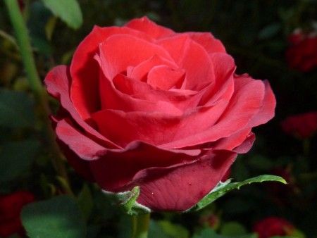Описание: Лепестки насыщенного кроваво-красного цвета, с более темными кончиками, образуют плотный и высокий бутон. Бархатисто-атласные цветы с заостренными лепестками раскрываются медленно, демонстрируя изящную форму и богатый цвет. Цветы розы долго сохраняют свежесть в срезанном виде. Листва светло-зеленая.